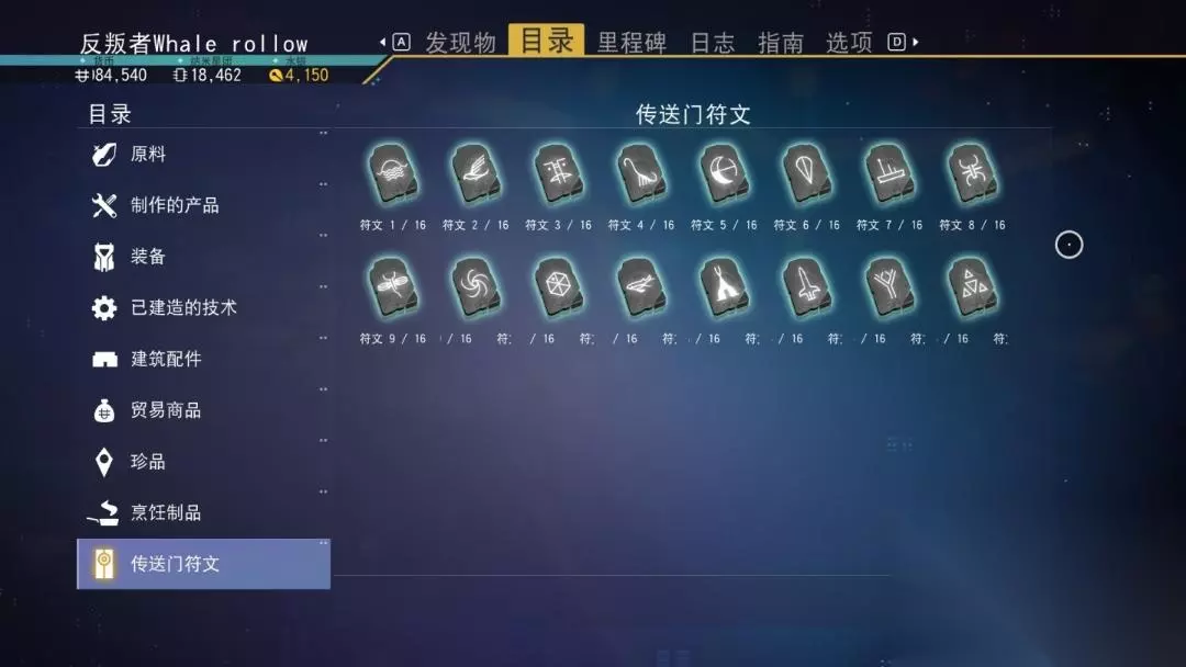 在目录可查看自己的符文在《无人深空》设定中,每个星球都有一个专属的坐标,而这个坐标就是由16个符文中的12个随机组成的代码,只要通过符文传送门输入对应的图案代码就可以快速穿越至对应星球,像经常能看到某吧大佬158分享的飞船坐标图,武器坐标图,还有黑盒里某些慈善家做的矿场分享图上都会有符文坐标,当然还包必须有符文才能做的活体飞船。 对于我来说,符文最大的作用可能是去网友们分享的神奇星球旅游抓宠物吧。 *打开拍照模式,图片左下方就可以看到星球的符文代码。