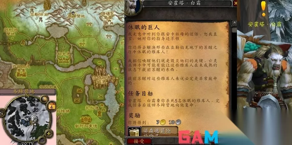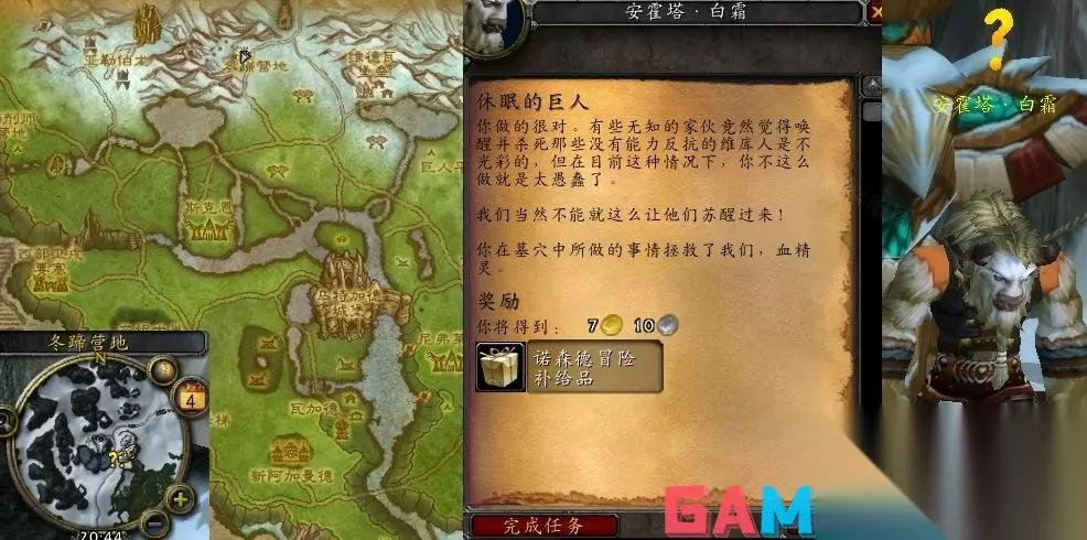 魔兽世界中休眠的巨人任务接取等级为68,接取NPC为安霍塔·白霜(嚎风峡湾,冬蹄营地),交付NPC为安霍塔·白霜(嚎风峡湾,冬蹄营地),奖励声望250点牦牛人。