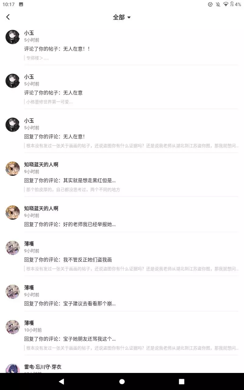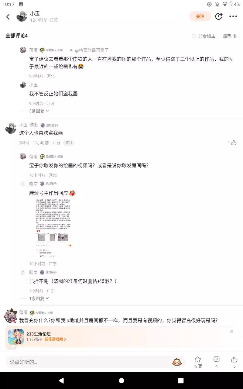 首先呢,这个人到好几位崩铁老师的图。各位想想你花费几个小时的画作被一个人盗了,你是如何感想?而且盗图者还毫不在意 ,他甚至追到咱们三圈,在帖子下骂,各位在崩坏三圈子里画画的老师,打上水印,不要被这个人盗图,昨天晚上的事。 @薪炎永燃 @雷电·忘川守·芽衣 @简·杜 @陌路尘埃
