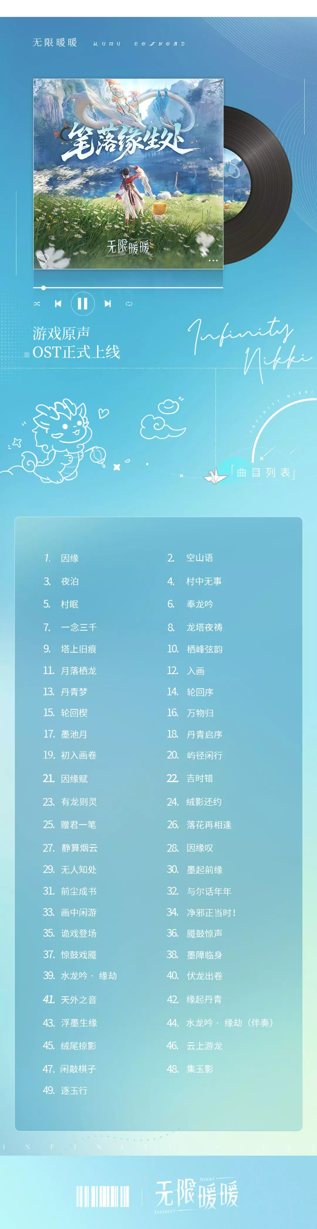 专辑共收录49首由叠纸旗下原创音乐团队FoldEcho出品的原声音乐,包括「丹青季」的活动版本音乐,如「丹青屿」区域音乐,以及部分关卡音乐、战斗音乐、动画演出配乐与PV音乐。