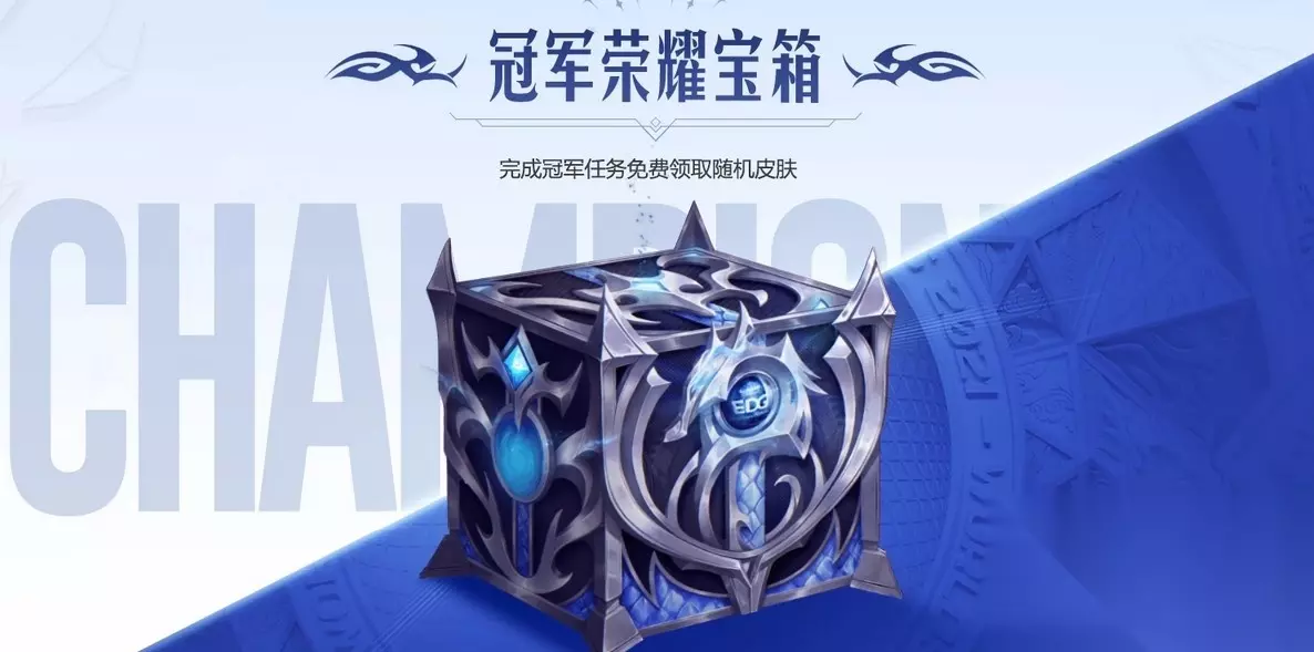 EDG冠军荣耀宝箱奖励 玩家在开启EDG冠军荣耀宝箱,可根据宝箱的级别,随机获得一款对应星级的皮肤。EDG冠军荣耀宝箱可通过完成获得界面中的冠军任务来提升。