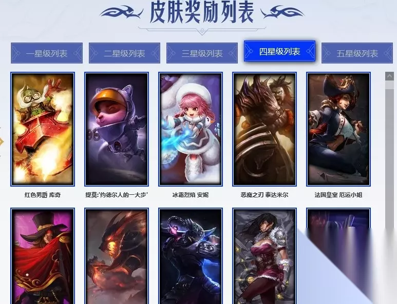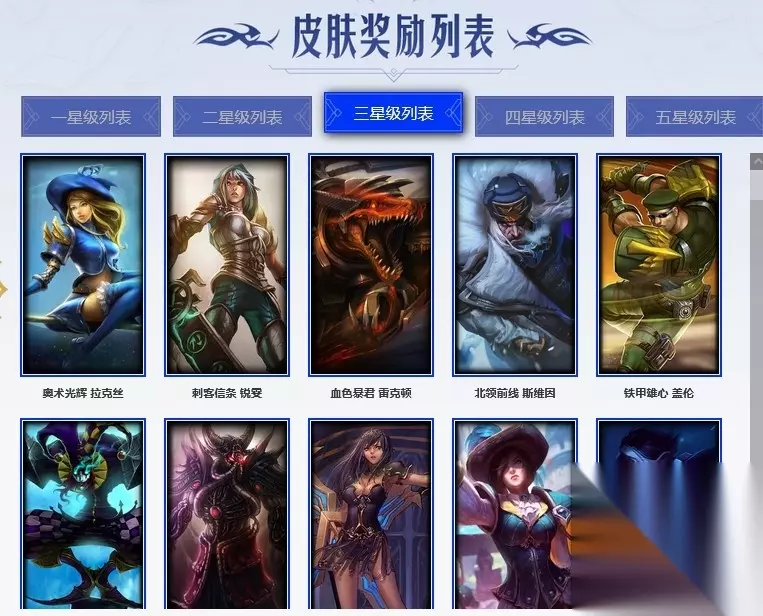奥术光辉 拉克丝、刺客信条 锐雯、血色暴君 雷克顿、北领前线 斯维因、铁甲雄心 盖伦、贵族血统 萨科、先驱行者 卡萨丁、战场公主 希维尔、皇家守卫 菲奥娜、夜鸦 菲奥娜、黑曜石守护者 墨菲特、灵骨工匠 奥莉安娜、小小骑士 阿木木、绞肉机角斗士 赵信、军神战甲 波比、孤高游侠 盖伦、飞越疯人院 萨科。 穿着正装的恶魔 维迦、月光女神阿忒弥斯 索拉卡、恶魔男爵 瑞兹、黑帮教父 格雷福斯、海牛猎手 菲兹、死亡骑士 盖伦、野火之藤 婕拉、帝王斑蝶 克格莫、焰尾妖狐 阿狸、冰晶之核 布兰德、地狱火 阿利斯塔、战争血统 蒙多、屠龙勇士 薇恩、凯旋英雄 嘉文四世、仲裁圣女 辛德拉、美酒节特使 古拉加斯、锦鲤 娜美。 驯龙女巫 璐璐、霓虹杀拳 蔚、黑帮狂花 金克丝、枯萎之壤 雷克顿、战地机甲 维克兹、白色死神 韦鲁斯、刀锋女王 丽桑卓、屠龙勇士 布隆、河水之灵 娜美、亚特兰蒂斯 辛德拉、暗黑武士 雷恩加尔、勇敢的心 奎因、生化博士 黑默丁格、摄魂男爵 弗拉基米尔、最后一只恐龙 纳尔、铁拳执事 蔚、星际之门 阿兹尔。 沙之守护 卡兹克、战地机甲 斯卡纳、腥红之月 伊莉丝、腥红之月 锤石、猛虎 布隆、苍穹之光 维克兹、光明骑士 诺提勒斯、永恒之森 巴德、黑暗骑士 艾希、黑暗骑士 沃里克、光明骑士 希维尔、铁血女忍 阿卡丽、沙之守护 泽拉斯、重生之沙 费德提克、天启骑士 杰斯、奥术大师 吉格斯、风执事 加里奥、时之砂 艾克。 大厨 塔姆、萌侦探 喵尔摩斯、女帝 厄运小姐、特种部队 普朗克、无畏号 墨菲特、黯焰双魂 千珏、炼狱魔女 蔚、掠星魔刃 卡萨丁、虚空使者 俄洛伊、幽冥领主 阿兹尔、瑞兹·白须、韦鲁斯·迅箭、古拉加斯·碎桶者、布隆·狮心、永恒之森 赫卡里姆、冰雪游神 巴德、死亡绽放 卡兹克、灰烬领主 奥瑞利安·索尔。 源代码 索拉卡、源代码 丽桑卓、无限烈焰 黛安娜、弗雷尔卓德 塔莉垭、银河魔装机神 希瓦娜、银河魔装机神 千珏、爵士 克烈、面包之王 潘森、糖果之王 艾翁、卡尔萨斯·祸害之光、瑟庄妮·逐晓者、杰斯·光明之锤、巴德·吟游诗人、源代码 卡蜜尔、晨星之翎 洛、暮星之羽 霞、雷霆领主 奥恩、赛博潮流 佐伊、腥红之月 伊芙琳。 四星皮肤: