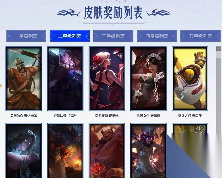 勇敢的心 泰达米尔、游侠法师 拉克丝、探戈灵魂 伊芙琳、法国女仆 奈德丽、钢铁之门 布里茨、弗拉基米尔侯爵、荒野幽灵 费德提克、武仙座海格力斯 赛恩、地狱厨房 莫甘娜、机械污染 辛吉德、情绪摇滚 阿木木、铬金铠甲 拉莫斯、虚空前世 卡萨丁、铁锈斑斑 布里茨、五杀摇滚吉他手 莫德凯撒。 铁哥们儿 奥拉夫、社会名流 乐芙兰、英仙座珀尔修斯 潘森、荒漠之咬 卡西奥佩娅、战地之王 加里奥、王子不是我 阿木木、魔灵 玛尔扎哈、屠龙勇士 嘉文四世、尼斯巨兽 科加斯、死亡骑士 内瑟斯、小丑工作坊 萨科、末日余生 布兰德、热带丛林 兰博、医学博士 凯南、忍龟 拉莫斯、哥特女仆 奥莉安娜。 五杀摇滚贝斯手 约里克、约德尔海贼团 崔丝塔娜、神圣守卫 蕾欧娜、远土之灵 斯卡纳、血色精锐 泰隆、怒之火炮 格雷福斯、战地法师 泽拉斯、钢之逆鳞 希瓦娜、苔原猎手 菲兹、雷霆领主 沃利贝尔、腥红之月 鬼武者 慎、战争机器 赛恩、海克斯科技 迦娜、荒野豺狼 沃里克、刀锋女王 莫甘娜、野兽女王 瑟庄妮。 死亡骑士 瑟庄妮、至高君王 玛尔扎哈、少校 吉格斯、百夫长 贾克斯、戴一个表 布里茨、地底迷城 诺提勒斯、烈焰雄心 崔丝塔娜、钢铁意志 潘森、科学狂人 辛吉德、五杀摇滚键盘手 娑娜、第三类接触 黑默丁格、沙漠风暴 卡特琳娜、战场女武神 凯尔、糖果女巫 璐璐、邪恶女巫 璐璐、黑帮狂花 厄运小姐。 科学怪熊的新娘 安妮、四神之力 乌迪尔、五杀摇滚主唱 卡尔萨斯、西部牛仔 崔斯特、紫晶射手 艾希、侏罗纪化石 克格莫、霹雳游侠 弗拉基米尔、嗜血行刑 蒙多、血色骑士 赫卡里姆、幽魂骑士 赫卡里姆、刺客信条 凯南、血色之锤 波比、夜行义贼 艾瑞莉娅、飞车暴走族 古拉加斯、夜魔水晶 韦鲁斯、少林武僧 贾克斯、前线指挥官 卡特琳娜、铁血帝皇 德莱厄斯、安伯斯与提妮、熔火之心 拉莫斯、皇家火枪手 崔斯特。 天人合一 易、全金属狂潮 杰斯、暗黑女武神 黛安娜、铁血猎人 雷恩加尔、火箭达人 崔丝塔娜、约德尔国队长 提莫、枯萎之壤 泽拉斯、大夏武士 潘森、五杀摇滚鼓手 奥拉夫、寒冰女皇 迦娜、斗牛士 阿利斯塔、死亡绽放 伊莉丝、深渊恐惧 锤石、血羽凤凰 奎因、夺命前锋 卢锡安、逆转裁判 崔斯特。 绿茵门神 茂凯、后场堡垒 阿利斯塔、狂热球迷 古拉加斯、特工狂花 厄运小姐、暗夜猫女 卡特琳娜、防弹武僧 李青、造物主 维克托、海贼魅影 卡特琳娜、主治医师 慎、腥红之月 卡莉丝塔、惊天魔盗 伊芙琳、绝影神偷 图奇、巡逻警官 特朗德尔、警长 沃利贝尔、沙之守护 拉莫斯、沙之守护 斯卡纳、腥红之月 基兰。 万能小丑 萨科、梅花国王 莫德凯撒、方块王后 辛德拉、莲花之令 艾瑞莉娅、梦魇 泰达米尔、逍遥赌侠 崔斯特、暴君 盖伦、无情重炮 格雷福斯、死亡之鹰 奎因、幽灵船长 普朗克、大力水手 普朗克、兔宝宝 菲兹、风纪委员 阿狸、热血班长 德莱厄斯、任性学霸 艾克、学生会长 弗拉基米尔、光明骑士 贾克斯。 黑暗骑士 奥拉夫、黑暗骑士 阿利斯塔、光明骑士 卡尔玛、狂鲨 亚托克斯、黑色天灾 辛吉德、恶咒亡魂 魔腾、硬汉 蒙多、怒熊 沃利贝尔、狂狮 纳尔、海皇姬 娜美、地狱送葬 约里克、牛扒狂战 奥拉夫、烧烤女神 蕾欧娜、狼外婆 沃里克、哞利斯塔、鳄霸 雷克顿、超级英雄 凯南、海贼参谋 斯维因。 三星皮肤: