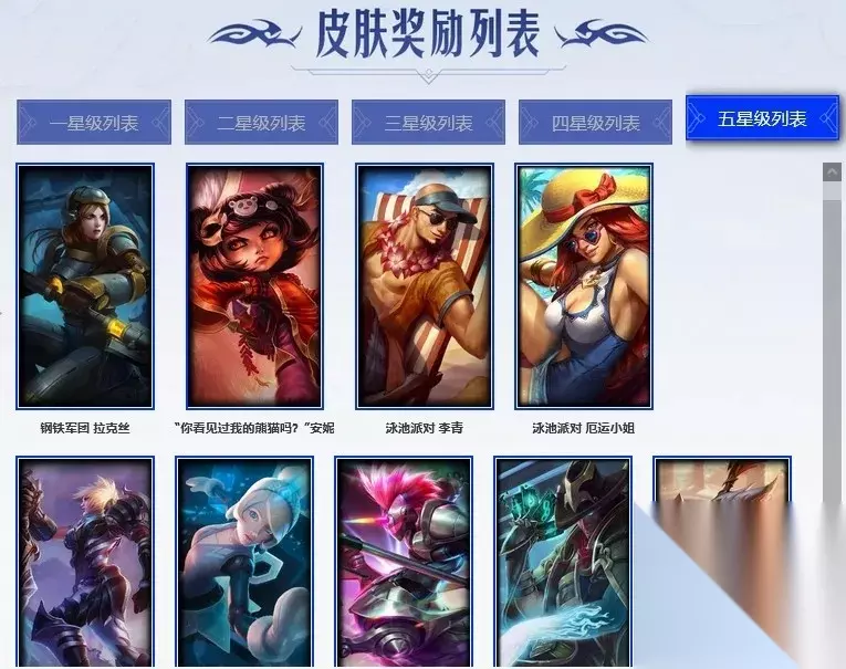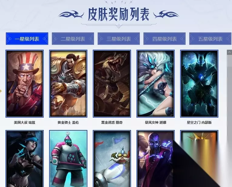 美国大叔 瑞兹、黄金骑士 盖伦、黑金诱惑 图奇、暴风女神 迦娜、星空之门 内瑟斯、黑暗女王 伊芙琳、冰球队员 贾克斯、雪橇速滑 库奇、宗师级法师训练师 瑞兹、自由女神 卡尔萨斯、联盟之喙 艾尼维亚、健美教练 蒙多、寒冰王座 卡萨丁、灰胡子魔法师 维迦、极寒 慎。 探戈灵魂 崔斯特、恐怖之源 萨科、急速前进 库奇、万人敌 潘森、冰河时代 奥拉夫、部落精神 瑞兹、拆弹专家 黑默丁格、烈焰猛士 奥拉夫、嘻哈精神 基兰、首领 图奇、梦魇 科加斯、深海一号 卡萨丁、冰壶选手 维迦、乡村农夫 古拉加斯、红色彗星 凯南、银色闪电 凯南。 索诺拉沙虫 克格莫、足球先生 伊泽瑞尔、红牌!退场! 卡特琳娜、深渊巨蟹 厄加特、重甲猎鹰 艾尼维亚、地狱火 莫德凯撒、冲浪高手 辛吉德、珊瑚礁 墨菲特、夜刃 艾瑞莉娅、潮流女王 乐芙兰、里尔击球手 特朗德尔、荒野之咬 雷克顿、横行霸道 图奇、日冕女神 卡尔玛、星河战队 雷克顿。 孤胆英豪 嘉文四世、侍魂 易、品酒大师 古拉加斯、幻影梦魔 魔腾、时间机器 基兰、海牛骑手 库奇、摩登骇客 薇恩、猎天使魔女 薇恩、古墓丽影 凯特琳、荒野女警 厄运小姐、劫掠梦魇 魔腾、斗战胜佛 孙悟空、沙暴巨蝎 斯卡纳、血色精锐 锐雯、符文生物 泽拉斯、杀出重围 格雷福斯、失落大陆 菲兹。 北地风暴 沃利贝尔、深海怪鱼 克格莫、初号机 维克托、特战先锋 赵信、死亡领主 莫德凯撒、灵魂收割者 德莱文、全金属狂潮 拉莫斯、蛇发女妖 卡西奥佩娅、复仇武神 贾克斯、血石妖后 丽桑卓、勇敢的心 艾希、蕉泥座人 索拉卡、单身贵族 内瑟斯、这货不是乌迪尔、鲛妮座人 娜美、暴龙 科加斯、翼龙 艾尼维亚、猛龙 雷克顿、这货不是维克兹、海牛大大 塔姆、紫水晶意志 塔里克。 二星皮肤: