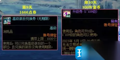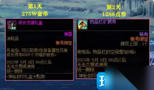 10、第十天就是升级券,是要100W金币,主要是进行升级的。 11、第十一天是成长支援礼盒,是要400W金币,有8张装备属性完美成长券。