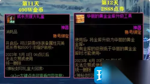 12、第十二天是华丽黄金金库升级券,是2888点券,是用来升级黄金金库的。 13、第十三天就是大回馈神秘礼盒,是200W金币,能从第1到第12天的神秘封印礼盒内置道具随机抽一个。 DNF2020活动 欲望之塔
