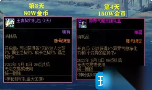 4、第四天是异界气息支援礼盒,这个是150W金币可以获得1个异界气息净化书和1个变异扭转书。 5、第五天是纯净的黄金增幅书,这个要1300W金币,是比拍卖行便宜的。