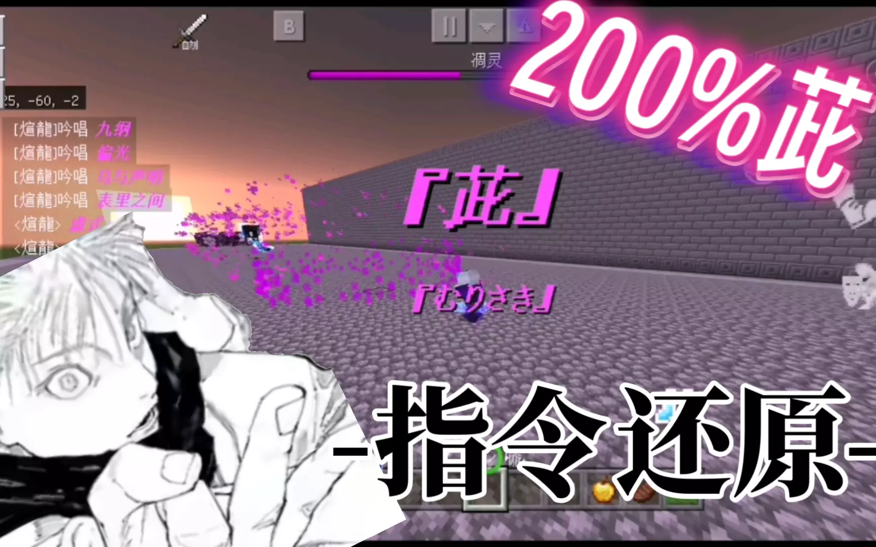 这是《我的世界》基岩版的领域对抗玩法内容,展示了“无量空处”“伏魔御厨子”等技能的对战场景,还呈现了术式熔断及熔断修复的相关玩法,属于黎明战争模组下的争斗玩法。