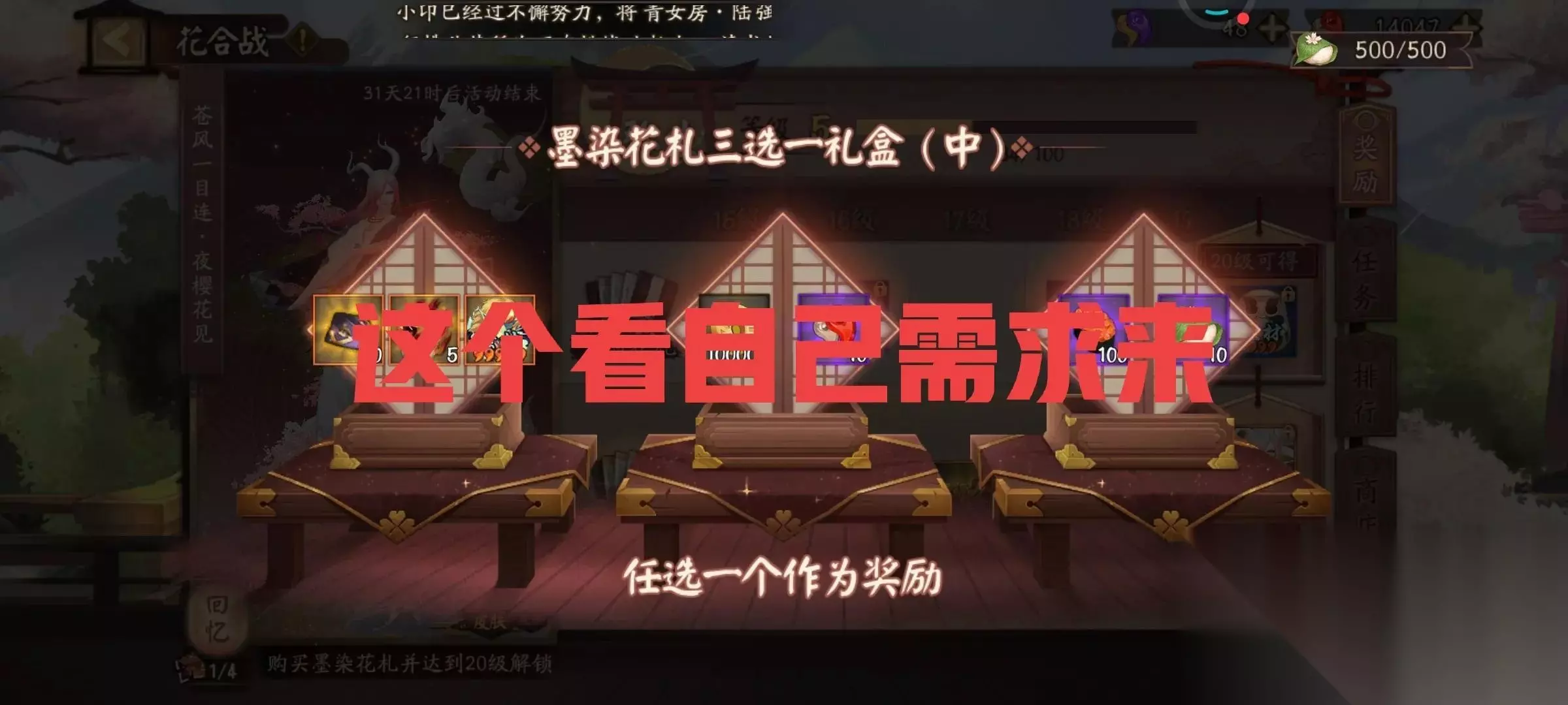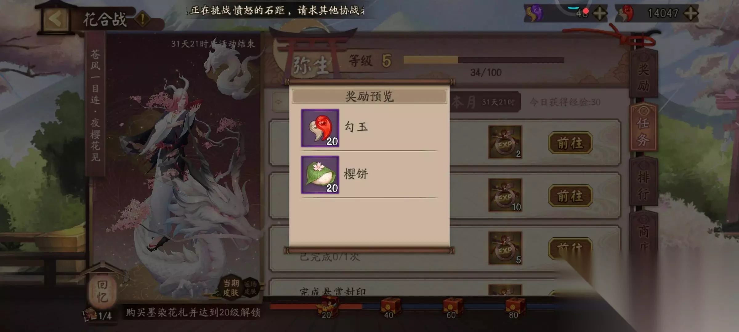 地域鬼王每天打1个是20勾玉,一般玩家按2个算(声望达到2000,这个不算难),也就是40勾玉。 每周第一次分享是有20勾玉一次的。【这个不要忘记了,推荐微信分享(无需真的分享)】 4、花合战 每天打完花合战100经验也是有20勾玉奖励的,随便挂下副本轻松到手。