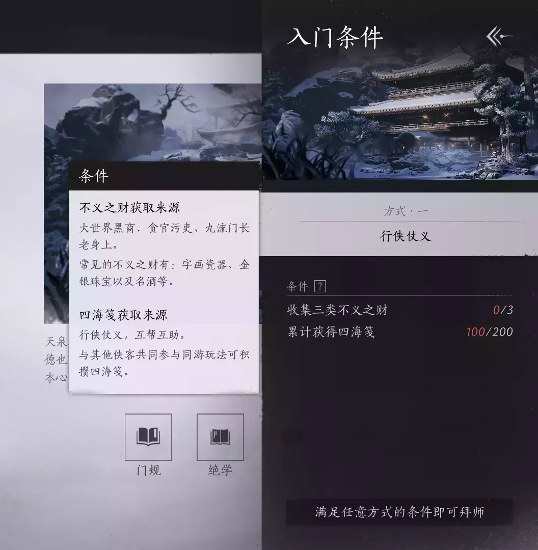 任务完成之后回到张一豪的位置,解锁入门条件,需要不义之财*3或者是四海笺,关于获取来源图我先放下面了,具体不义之财怎么获得,目前已知的是可以和拥有不义之财的人进行话术、治疗等玩法来索要,可以通过V进入听声辨位状态后查看包裹;而四海笺是联机活动获取的,应该不算太难。