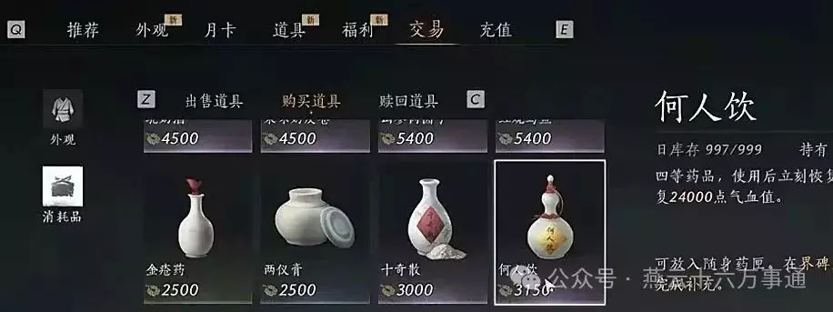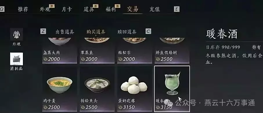 打开商城,找到交易一栏,在消耗品里购买暖春酒、驼奶酒和何人饮: