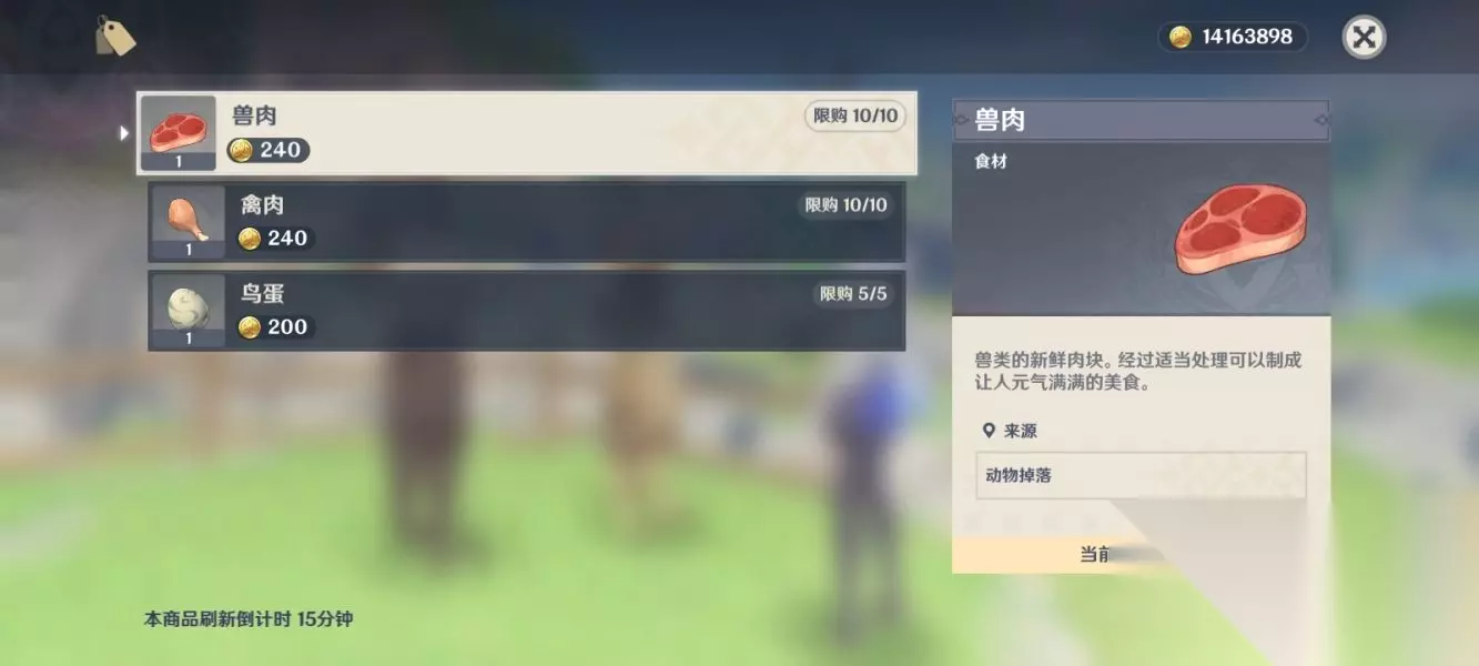2.缺肉可以找①蒙德城堤米,他家的鸽子很多,轻松获得大量禽肉,找一个范围性伤害的角色,哪里鸽子多就就去哪里放个技能,禽肉就有了!我用夜兰的! ②也可以去清泉镇找到猎人杜拉夫,在这里可以买到兽肉×10/禽肉×10/鸟蛋×5