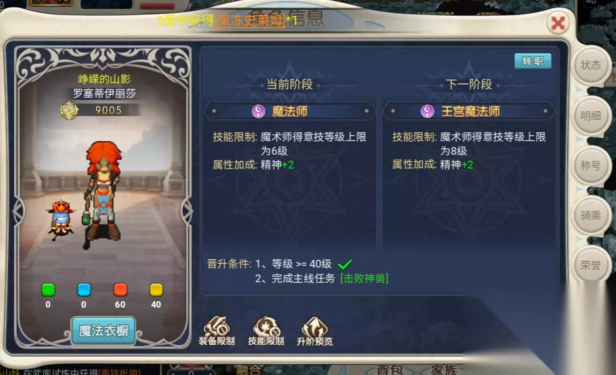 首先打开左上角点开角色信息,可以看到目前自己是哪种职业,点击职业可以看到当前阶段的职业和下个阶段的进阶职业,以及技能限制和属性加成升阶预览等还有晋升条件:一般是等级大于40级还有完成主线任务,当然如果想要转职的话,可以看到右上角有一个转职按钮,点开之后可以看到可以选择八个职业,可以点开你想选择的职业或者都浏览一变,选择你最感兴趣或者比较擅长的职业,可以看看练级能力单挑能力还有生存能力等等,也可以清楚的看到这个职业的得意技有哪些在后面转职后这个选择就需要慎重考虑了哦