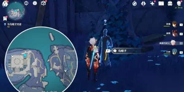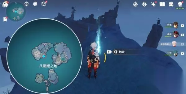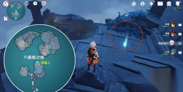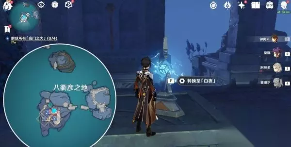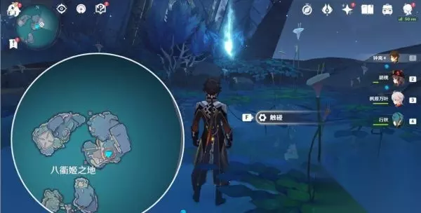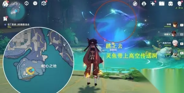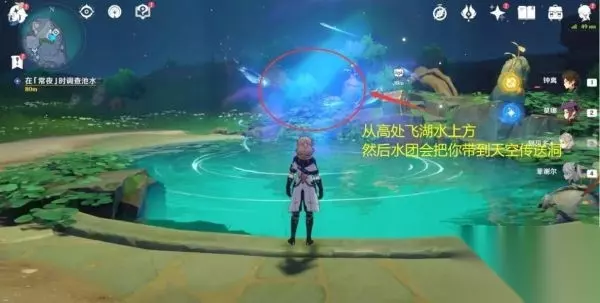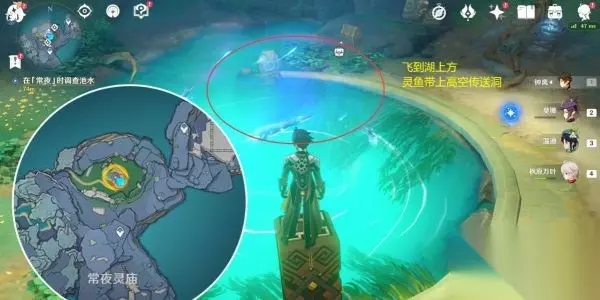 第一个试炼地【八衢彦之试炼】 2.在「常夜l时调查池水,跟着指引过去,如下图,附近有怪物,击怪物后可以获得珍贵宝箱,在湖上方有灵鱼,找个稍微高一点的地方滑翔过去就可以乘着它门飞向天空中的传送洞,传送洞可以飞到八衢彦之地。