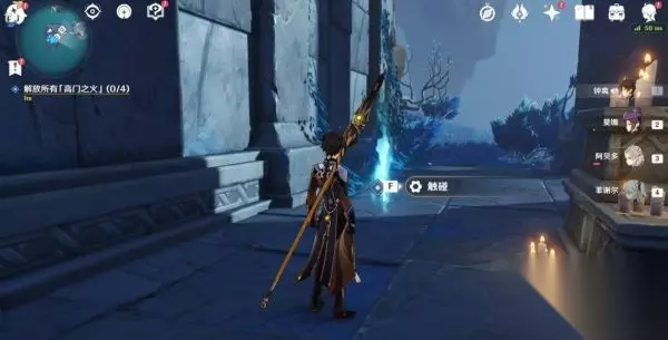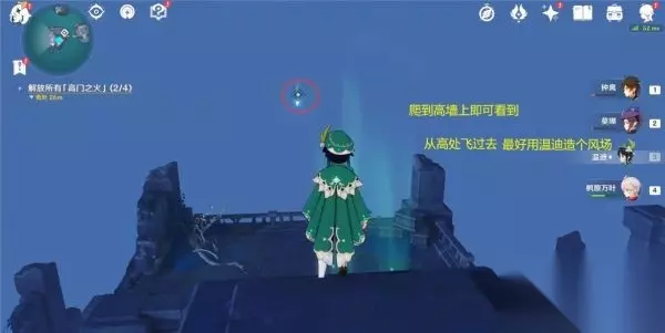 8.第三个「高门之火」,在低空中,爬到高墙上就可以看到,在高处造个风场或者岩造物垫了飞过去(可以使用:温迪,万叶或钟离、阿贝多、岩主)。