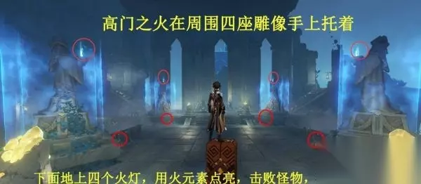 解密:先准备角色,需要战斗,用火元素点亮地上的火炬,出现四波怪物, 第一波:四只流血狗; 第二波:冰、火、雷三个深渊法师。 第三波:两只深海龙;第四波:一个水深渊使徒。 击败怪物,解开雕像周围的禁锢,爬上去拾取,即可拿完四个「高门之火」。 24.拿到齐四个「高门之火」后,跟随指引过去,与灵魂大门对话,第三个试炼完成,同时获得成就【常世无双】小锦旗。