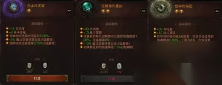 如果是玩纯召的死灵法师,因为“技能伤害”和“每次攻击增加伤害”的加成对召唤物无效(NGA贴测试),但主要攻击和伤害增加有效,所以可以舍弃狂热之牙,换成自由与虔诚增加召唤物时间和能量核心增加。之后两个孔位可以选择追随者的重担+猎神的凝视的组合,都能增加伤害。