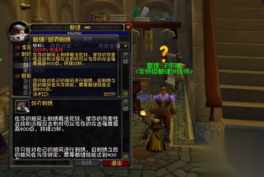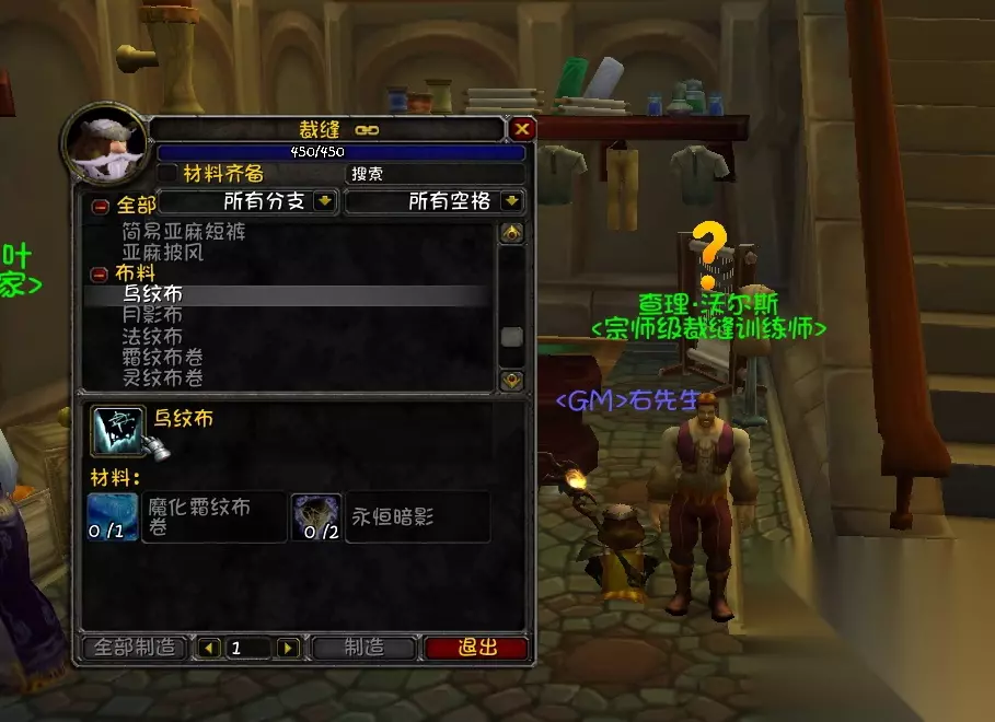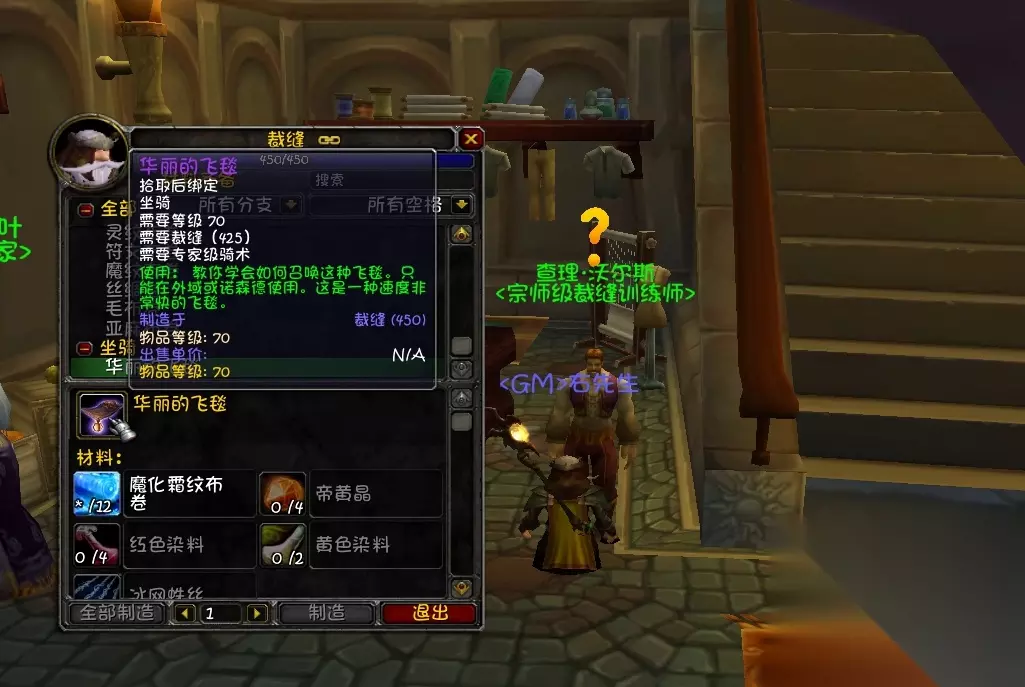除了属性收益之外,裁缝还可以做一个魔毯,属于飞行坐骑,工程有陆地双人摩托,裁缝有飞毯,这都属于坐骑控的标配。 最后给想要冲裁缝的朋友一个1-375最省钱的速冲攻略。 1-50 亚麻布卷 亚麻布*300(做到灰色,后续按需做) 50-60 亚麻包 粗线 *120 60-75 强化亚麻斗篷 75-105 毛布卷 毛料*200(做到灰色,后续按需做) 105-110 灰色毛纺衬衣 细线*140 灰色染料*10 110-125 双线毛纺护肩 125-145 丝绸卷 丝绸*200(做到灰色,后续按需做) 145-160 碧蓝丝质头巾 蓝色染料*40 160-175 丝质头带 175-185 魔纹布卷 魔纹布*600(做到灰色,后续按需做) 185-200 深红丝质外衣 红色染料*40 200-215 深红丝质马裤 丝线*40 215-225 橙色魔纹衬衣 橙色染料*20 粗丝线 *100 225-250 魔纹包 250-260 符文布卷 符文布*800(做到灰色,后续按需做) 260-275 符文布腰带 符文线*100 275-300 符文布手套 300-325 灵纹布卷 灵纹布*1000(做到灰色,后续按需做) 325-340 灵纹布包 (做到灰色,可以放AH卖,有赚) 340-350 灵纹长靴 结缔皮*40 350 —— TBC升满需要继续做魔化灵纹套装,如果TBC不追求升满,则可以等WLK再升,350以上可以做霜纹布,80级很好升。 注意80级的裁缝,350之后就可以搓霜纹布了,所以350之后的技能点数可以等80级再升,会更省钱。 如果是TBC就想要升满做装备的朋友,350-375需要做魔化灵纹套装,自己去买图纸做即可。