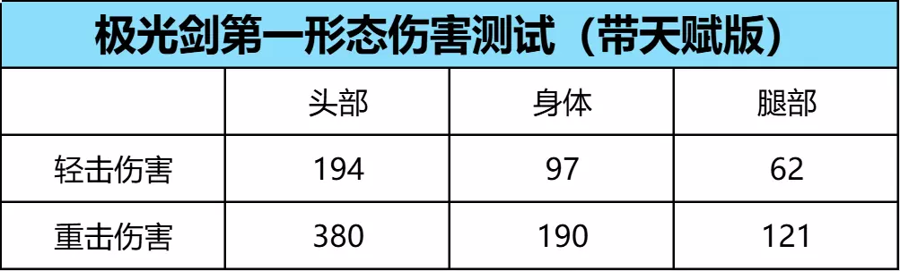 来看看初始形态下的极光剑,相较于另一个形态,只是缺少了一个极光盾,伤害表现方面还是十分不错的,当算上天赋后,轻击伤害可以高达97,即使命中腿部也有62点伤害~