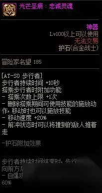 护石对三个功能进行了优化。 (1)佩戴护石后步行者的持续时间增加10秒,并在持续时间结束后变为跑向前方自爆,技能由原本的20秒延长到了30秒,若输出时间超过30秒则可以等效成55%的增伤。 (2)增加一次可搭乘次数,算是额外增加一次无敌的机会,增加容错。 (3)增加20%移动速度并删除搭乘状态下的技能释放动作,大大提升了搭乘状态下的手感,但搭乘时可以释放的技能过少,且多为伤害较低的小技能,所以高阶副本作用有限,在搬砖地图的效果会更加明显。 20秒内的伤害提升率为0,若跟随30秒打满伤害并自爆,则伤害综合提升率在55%左右,高阶副本中不建议佩戴,用于搬砖比较合适。