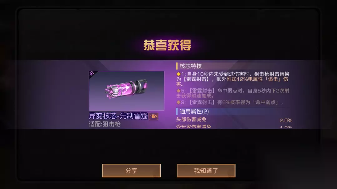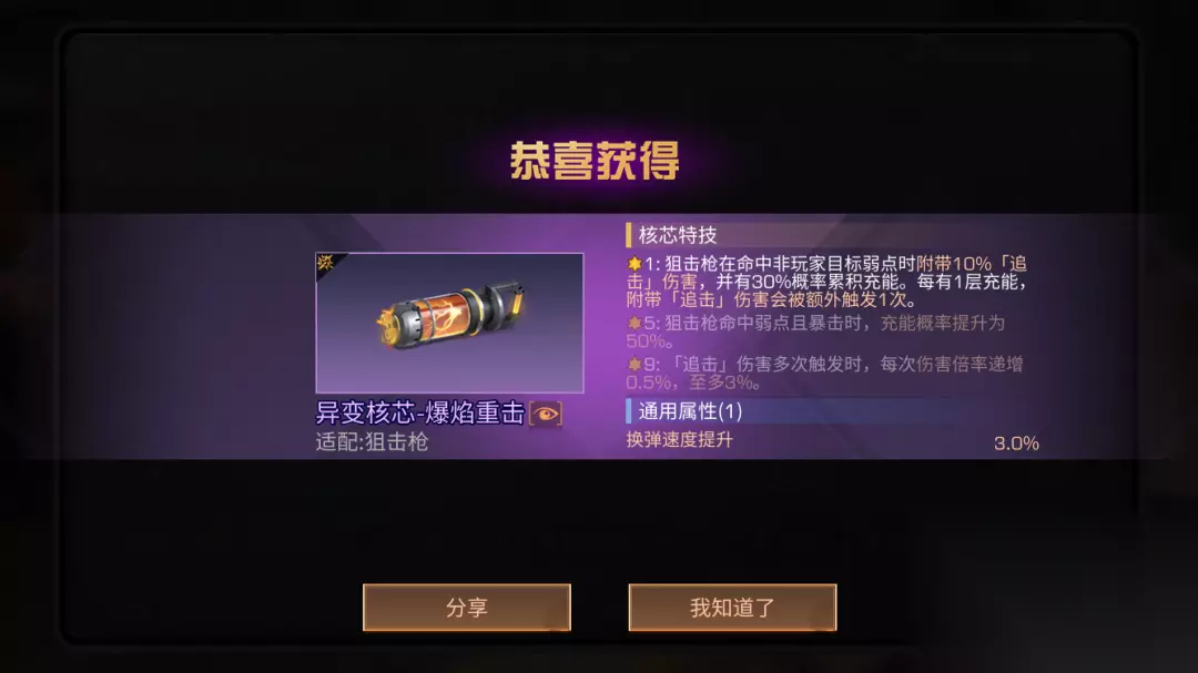 【雷霆射击】命中弱点时 自身5秒内下2次射击获得射速加成 ★9 【雷霆射击】有6%概率视为「命中弱点」 狙击燃烧核芯-爆焰重击
