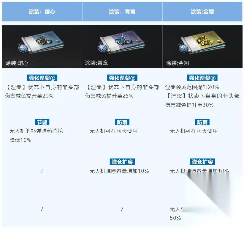造成伤害会加速充能 充能完成会解除重伤并获得高额回复 涅领域内解除重伤不会进入虚弱 无人机涂装