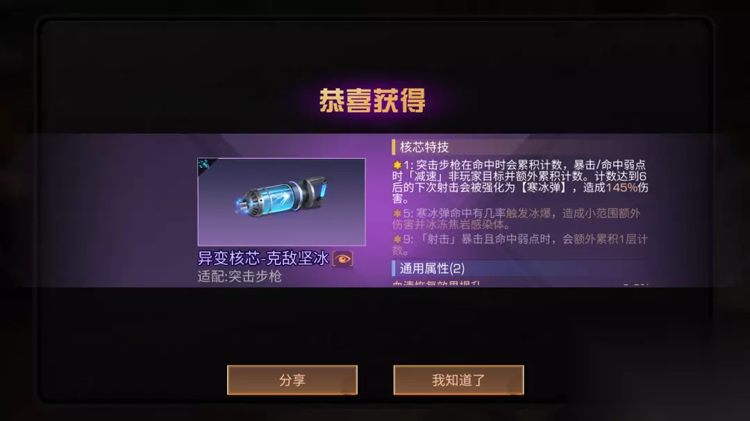 突击步枪在命中时会累积计数 暴击/命中弱点时减速非玩家目标 并额外累积计数 计数达到6后的下次射击 会被强化为【寒冰弹】造成145%伤害 ★5