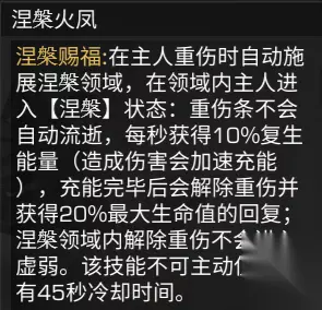 涅槃火凤可以为主人在重伤时回复生命值 并且解除虚弱效果 在PVP和PVE中 可以产生出乎意料的效果!