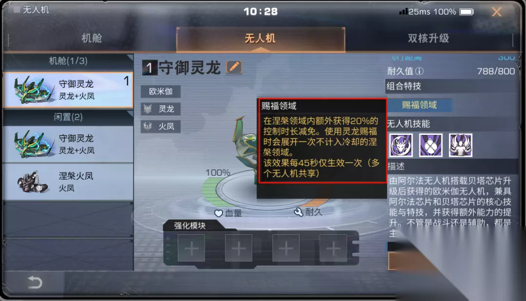并且使用灵龙赐福时会展开一次 不计入冷却的涅槃领域 该效果每45秒仅生效一次 (多个无人机共享)