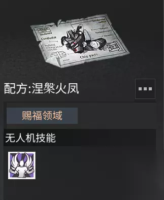 无人机技能选择 火凤涅槃无人机在主人进入重伤状态后 会施展涅槃领域并获得复生能量 复生能量充能完毕后会解除重伤并 获得20%最大生命值的回复 施展涅槃领域时若无人机被击败会中止施放 因此,防御属性对于火凤涅槃无人机来说 比攻击属性更为重要!