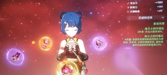 好吧,我们回到主题。副C和道具人香菱推荐穿恶魔套装。那么杯子、沙漏、帽子的属性就是元素火元素加成和元素熟练度。由于我没用过香灵元素,所以就不多评论了。