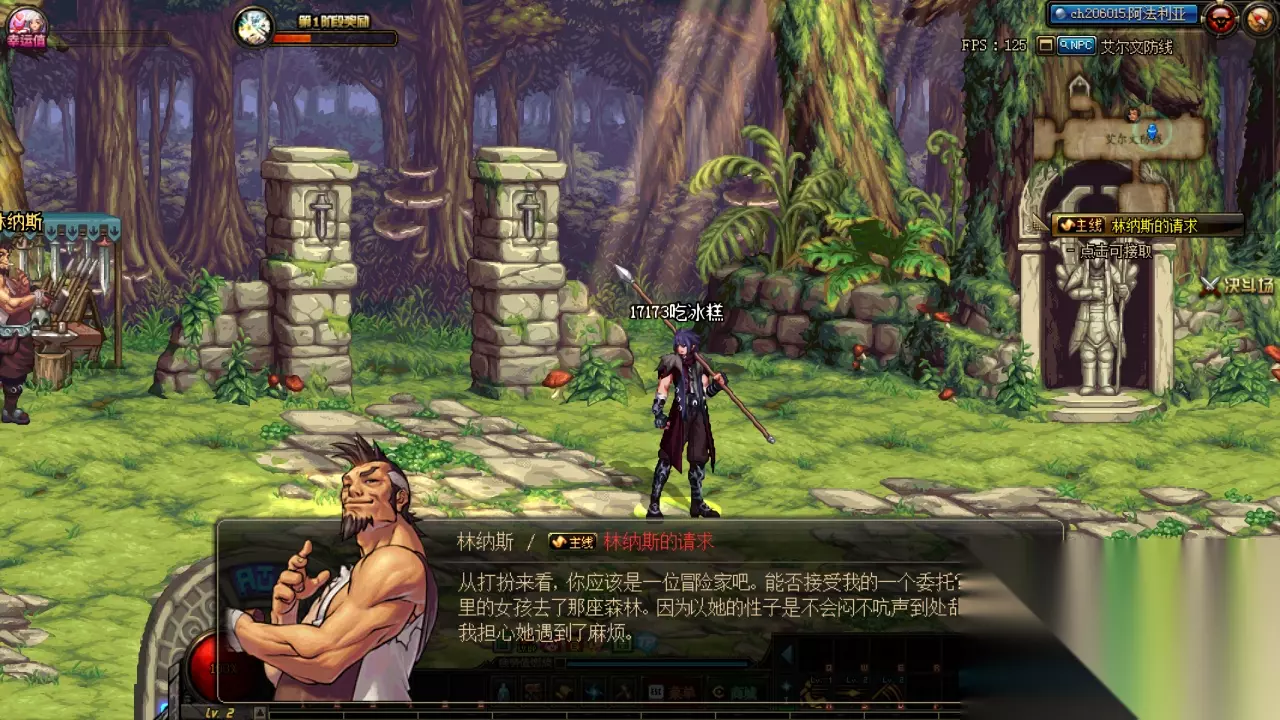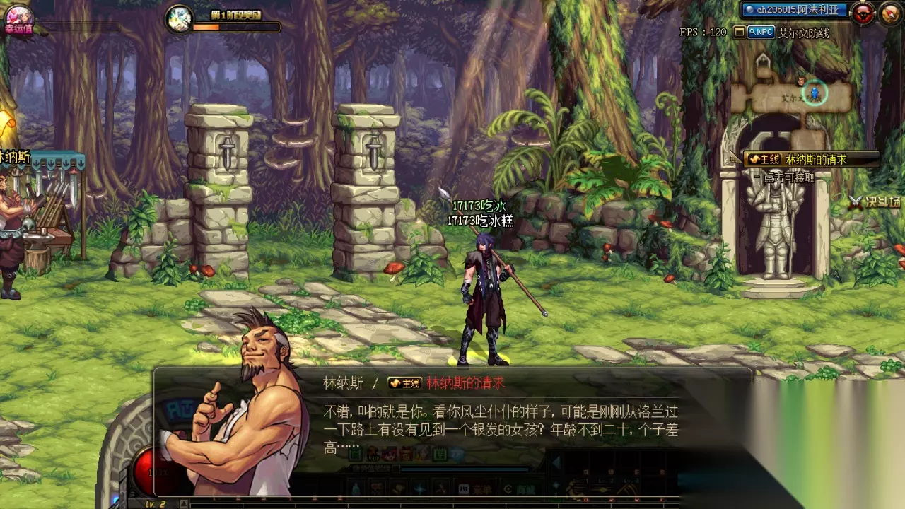 从建立角色界面可以看到两个职业的立绘和简介,两个职业均为魔法系职业,其中狩猎者除了辅助能力其他均不错,而暗枪士拥有超远的攻击距离但是攻击范围不大,作为曾经的超一线辅助米雪决定玩个毫无辅助能力的狩猎者吧,然后就是建号起名字进入游戏,看过各种版本前瞻的小伙伴们应该已经知道改版后任务地图全部改变了,不过角色的开场动画是没有变化的就不多说了直接给小伙伴们看看初始地图吧,根据你所选择的角色不同第一个任务和遇到的人都有所不同的