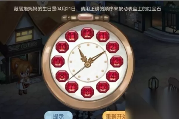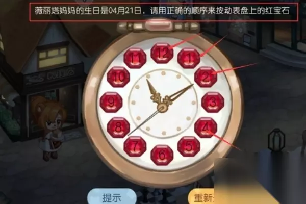 2、进入关卡后,会告诉你薇丽塔妈妈的生日是4月21日,让我们使用正确的顺序来按动表盘上的红宝石。