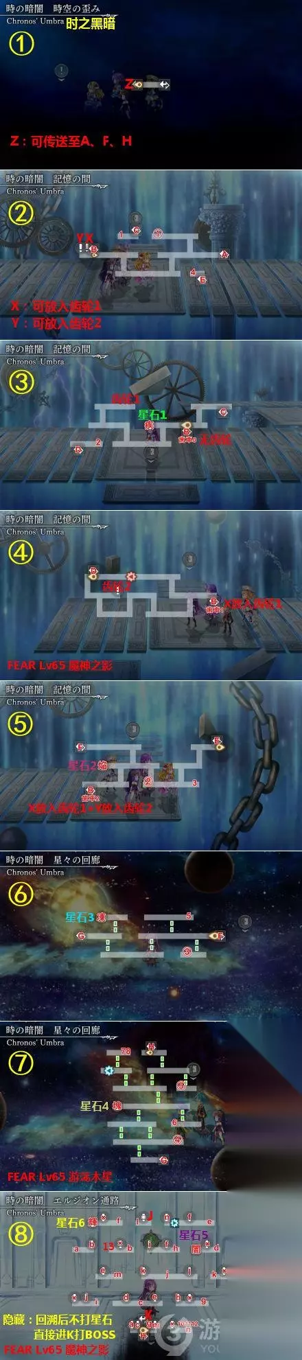 25章时之黑暗 地图:8张 流程: ①记忆之殿:A→B→星石·疾→齿轮1→B→X→B→齿轮2→B→Y→B→星石·焰→F ②繁星回廊:F→星石·凍→G→星石·塊→H ③埃尔吉昂通道:H→c→d→星石·闇,H→c→e→f→星石·輝,H→g(摇篮)→h(积木)→i(卡片)→j(小孩)→l(小孩)→J(猫)→K 宝箱:13个 闪光:5个 隐藏要素:通关后从次元夹缝左边第2个门回溯到时之黑暗,不打6个星石,直接到埃尔吉昂通道打BOSS。详见第1部 隐藏要素合集 FEAR:Lv65魔神之影,Lv65游荡木星(和次元漩涡不同) BOSS:星石×6,无弱无耐。 最终BOSS:克洛诺斯·梅纳斯,无弱无耐 行动模式:没打哪个星石就具有哪个(被动)技能,打了就没有那个(被动)技能。 被动技能 凍:AF不可用 焰:每回合结束我方全体受到300伤害 闇:奇数回合物理吸收、偶数回合魔法吸收 輝:每回合回复HP8000 R1 单体物理 R2(疾) 全体HP90%伤害 R3(塊) 全体随机异常状态 R4 全体火魔法 R5 敌我双方BUFF/DEBUFF解除 R6 全体地魔法 R7 全体1200伤害 以上就是另一个伊甸超越时空的猫25章时之黑暗地图收集攻略了,希望对大家有所帮助。