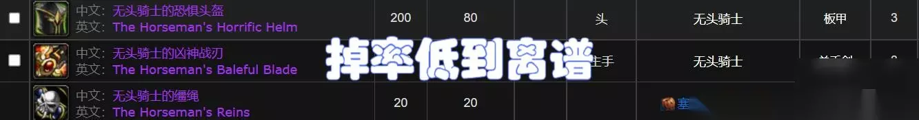 根据数据库中的数据,无头骑士的缰绳掉落率为1%,单手剑板甲头部的掉落率仅为3%。已知这三个物品的掉落是独立事件,因此三个道具一起出现的概率为0.01*0.03*0.03=0.000009,只有百万分之九。看到这个数据后,小檀也是震惊了。不知道这位玩家把自己所有的好运气都用在了魔兽世界经典服务器上是好事还是坏事? 好吧,这里有一些完美的掉落物可以让你从WLK怀旧服务器一次性毕业。怀旧服的玩家们是不是也吸收了满满的欧式风格呢?也许下次你就是幸运儿,获得无头骑士和大量毕业装备!