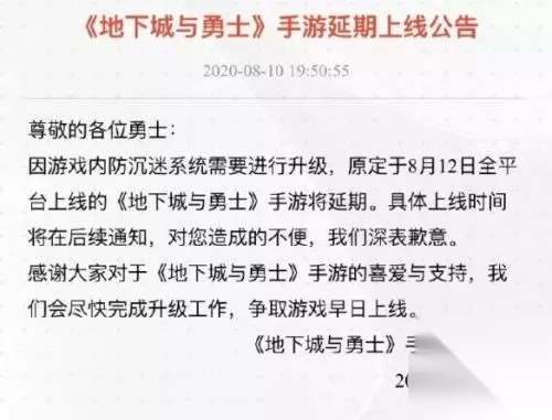地下城与勇士M延期真实原因 一、官方回答 官方说法是游戏的“防沉迷系统”还没有完善,需要更新升级。 至于要多久,官方并没有给出明确的上线时间。 日期从12号开始无限延迟,不由得让很家开始怀疑防沉迷升级的真实性。