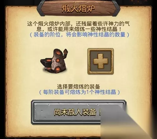 4、煅火熔炉 可将放入的装备 熔炼为神性结晶 获得神性结晶的数量为装备的阶数 熔炼有概率额外获得1个随机普通刻印 分解6阶装备可获得煅火刻印