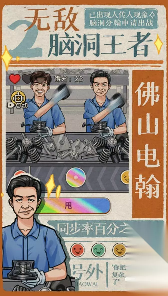 扮演一位皇帝,每天要应付各种奇葩大臣和后宫妃子的“刁民”行为。游戏融合策略和搞笑剧情的元素,属于硬核剧情走向类型的手游,你的每个选择都会影响国家命运——是严惩奸臣还是放任不管?是宠爱贵妃还是冷落皇后?对话充满无厘头幽默,比如大臣用“996福报”忽悠你加班批奏折。玩法轻松但考验决策能力,一不小心就会被“刁民”整得哭笑不得。 高速下载 普通下载 3、《无敌脑洞王者2》