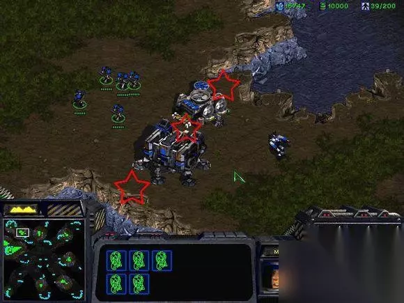 图示为big 3点位置,初玩星际的时候小编经常用三个房子来堵路,没想到一个房子和兵营就可以轻松堵住,现在想想还是太年轻了!