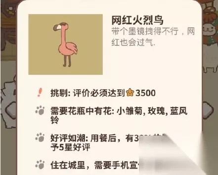 网红火烈鸟:带个墨镜拽得不行,网红也会过气. 1、挑剔: 评价必须达到星星3500 2、需要花瓶中有花:小雏菊,玫瑰,蓝风铃 3、“好评如潮:用餐后,有30%的概率给予5星好评 4、住在城里,需要手机宣传才能招揽