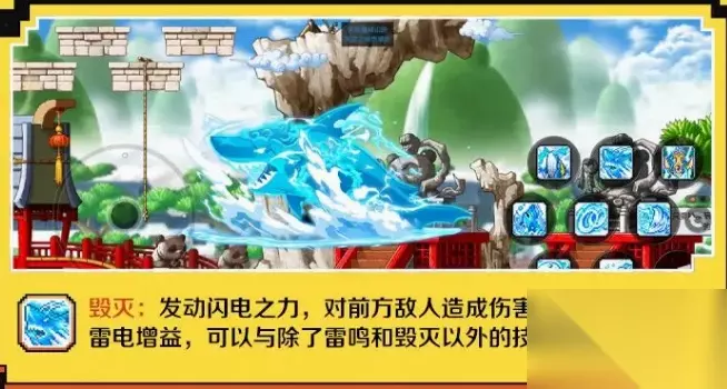 职业技能介绍: 毁灭: 发动闪电之力,对前方敌人造成伤害。毁灭不会产生雷电增益,可以与除了雷鸣和毁灭以外的技能连接使用。