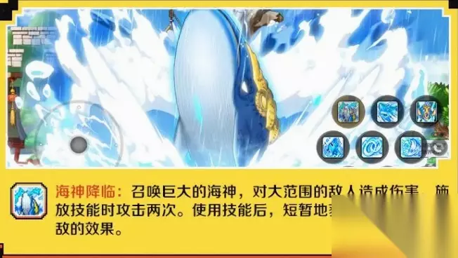 海神降临: 召唤巨大的海神,对大范围的敌人造成伤害。施放技能时攻击两次。使用技能后,短暂地获得对所有攻击无敌的效果。