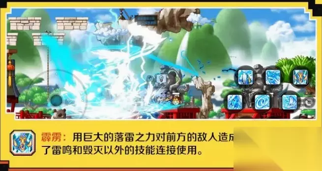 霹雳: 用巨大的落雷之力对前方的敌人造成伤害。可以与除了雷鸣和毁灭以外的技能连接使用。