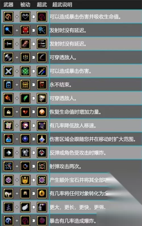 吸血鬼幸存者游戏中有很多超武可以通过指定的武器道具合成,不过每个武器的合成方法和道具都不同,那么具体该如何合成呢?下面就来一起看看2023的最新合成条件一览吧。