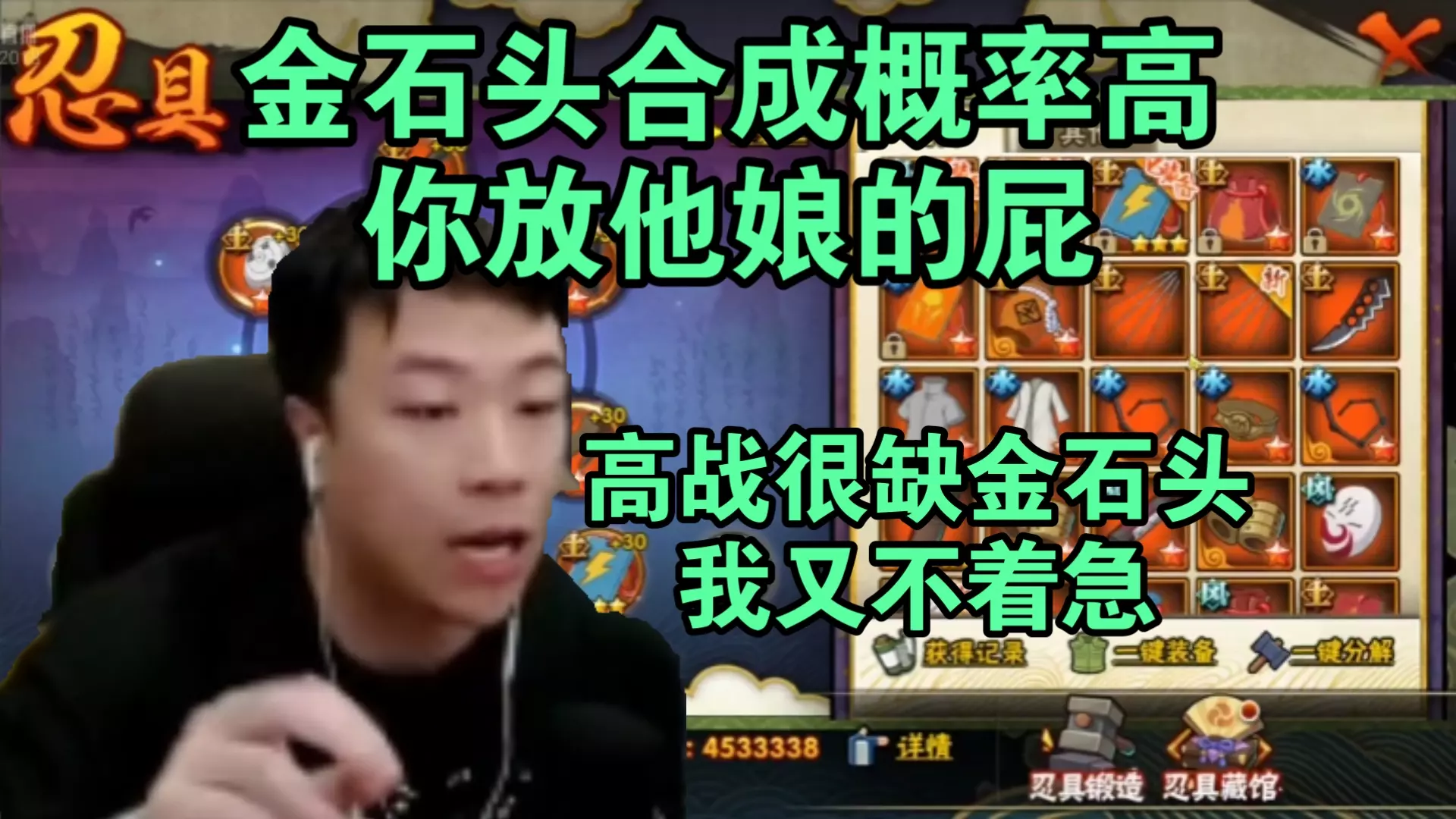 火影手游忍具合成规则 散装合成散装,有小概率出套装, 如果你的传说忍具是散装,在合成的时候耗费的材料是3个高级和30个中级,但是随机出来的大概率是散装,有小概率会出套装,但基本上是不会出究忍具。 套装合成套装,有几率出究 用套装合成的话,耗费的材料大幅度提升,需要10个高级和180个中级,但是可以随机出现究套装,规律是套装合成出同套装的随机部位,比如用止水套装合成就会出现止水套装随机部位,所以想要痛楚究套装就尽量用痛楚忍具合成。 用多余的究套装合成是必出究套装的,但是耗费的材料非常高,需要40个高级材料。