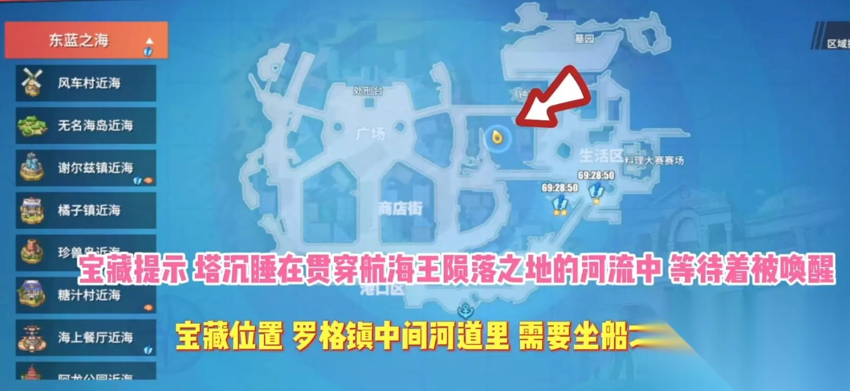 第四处宝藏: 罗格镇中间河道,这个位置需要玩家坐船过去。航海王陨落的河流中。