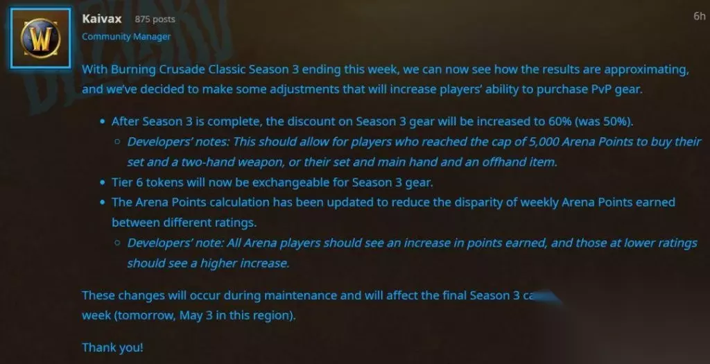 暴雪发布了最新蓝帖,针对竞技场S3赛季的部分改动做了官方说明。