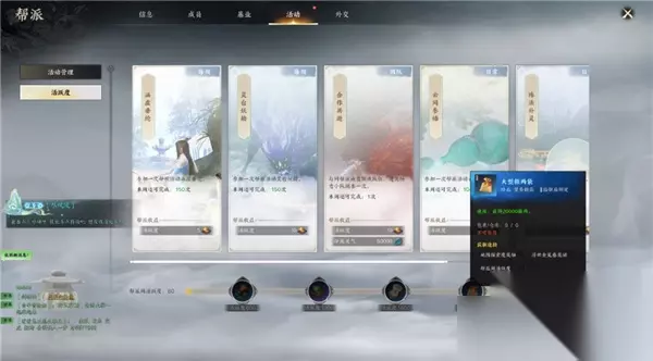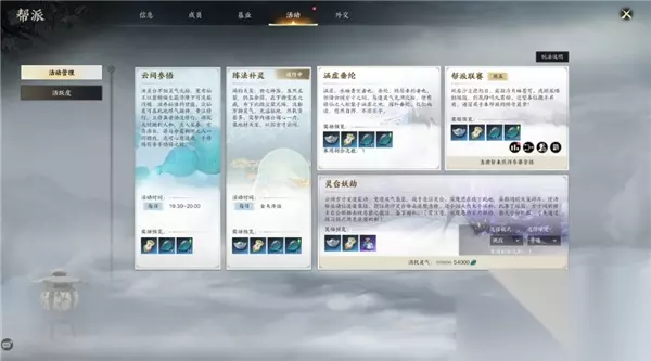 6. 阵法补灵与云间参悟 不要忽视阵法补灵和云间参悟这两项活动。完成这些任务不仅能帮助你提升角色的属性,还能带来丰厚的奖励。每天都应该做这两项任务,确保不漏过任何一次提高自身实力和财富的机会。 7. 帮派活动 加入一个活跃的帮派后,你可以参加帮派钓鱼等活动,获得额外的奖励。例如,第一天帮主会开启帮派钓鱼活动,你只需要留存100元气钓到任务鱼,完成个人任务后,你就可以获得5000银两和200帮贡。更重要的是,帮派的公共奖励会通过邮件发送,包括7500银两和150帮贡。记得多存帮贡,因为它在后期会变得非常有价值。