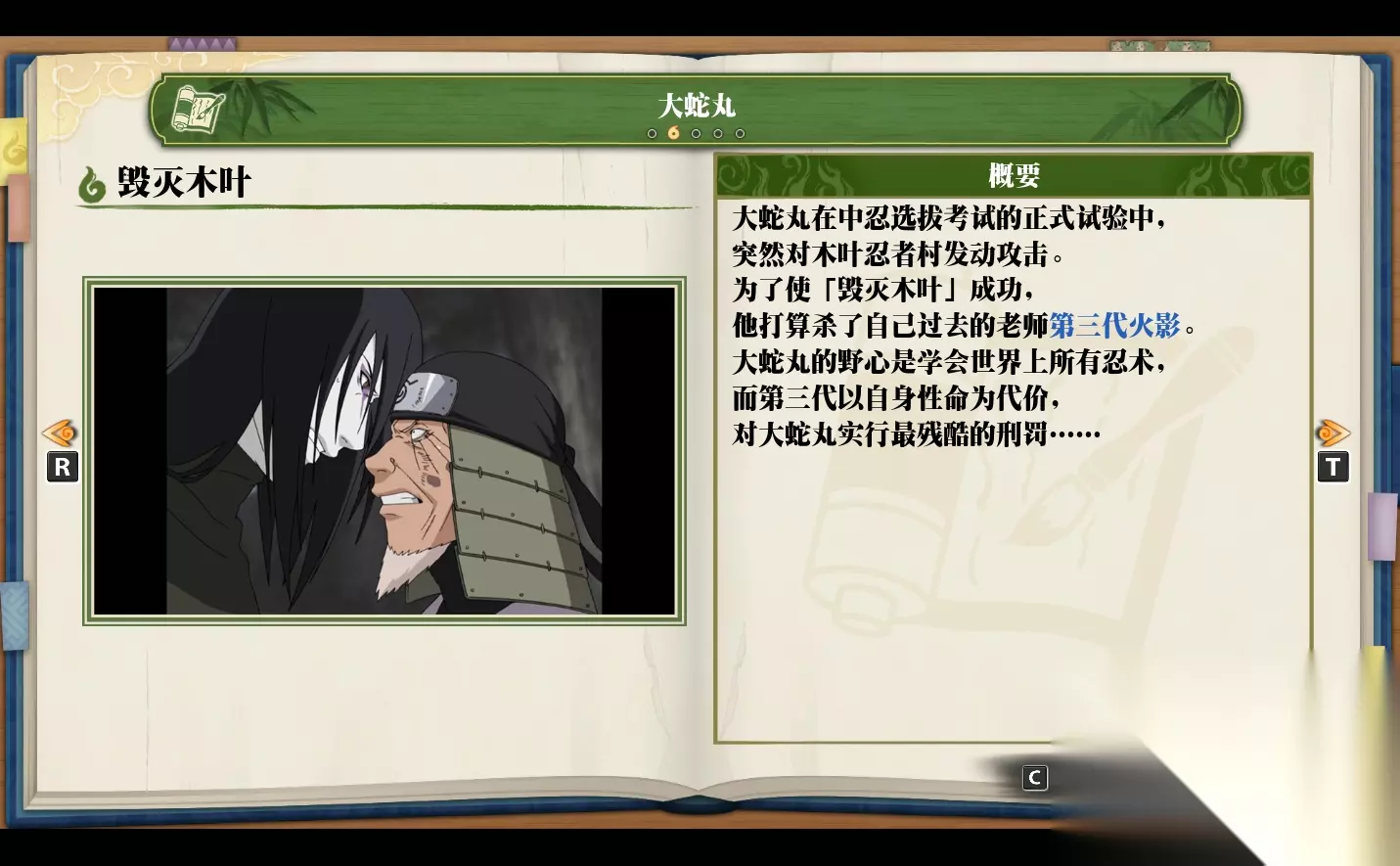 《火影忍者:终极风暴羁绊》大蛇丸 毁灭木叶介绍 大蛇丸在中忍选拨考试的正式试验中,突然对木叶忍者村发动攻击。为了使「毁灭木叶」成功,他打算杀了自己过去的老师第三代火影。大蛇丸的野心是学会世界上所有忍术,而第三代以自身性命为代价对大蛇丸实行最残酷的刑罚·······