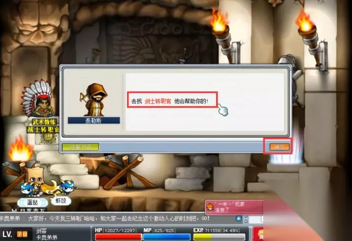 2、与他对话会让你去找剑士转职官,点击确定就会自动传送。